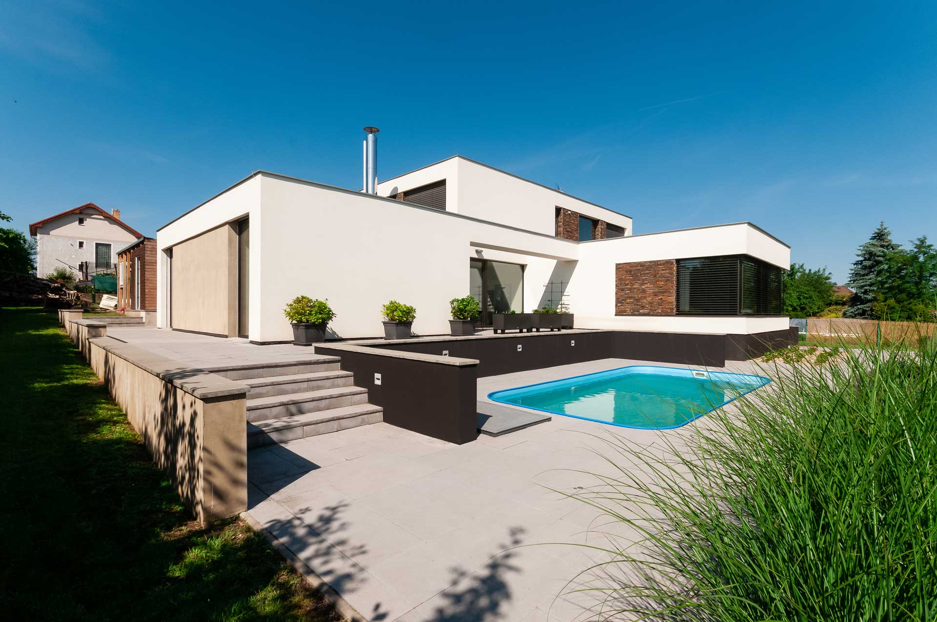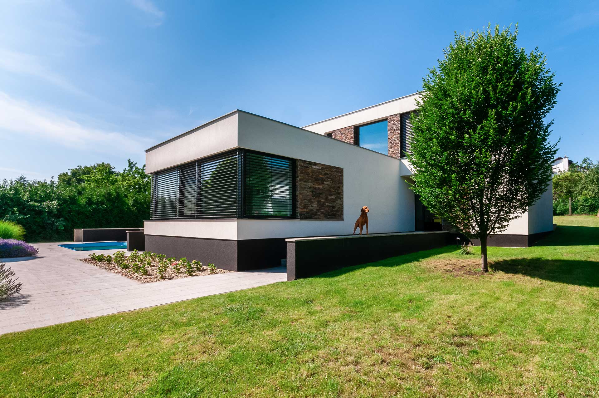 Veľkorysá moderná rodinná vila v Brandýse leží na okraji záhradkárskej kolónie, v tichu, zeleni a s výhľadom na Labe. Jej majiteľ, pán Dvořák, ju s pomocou niekoľkých murárov staval vlastnými rukami. Veľkoformátové okná s našimi PVC profilmi Eforte a takisto vnútorné i vonkajšie tienenie im následne inštalovala ich vlastná firma – Samat, spol. s r. o.