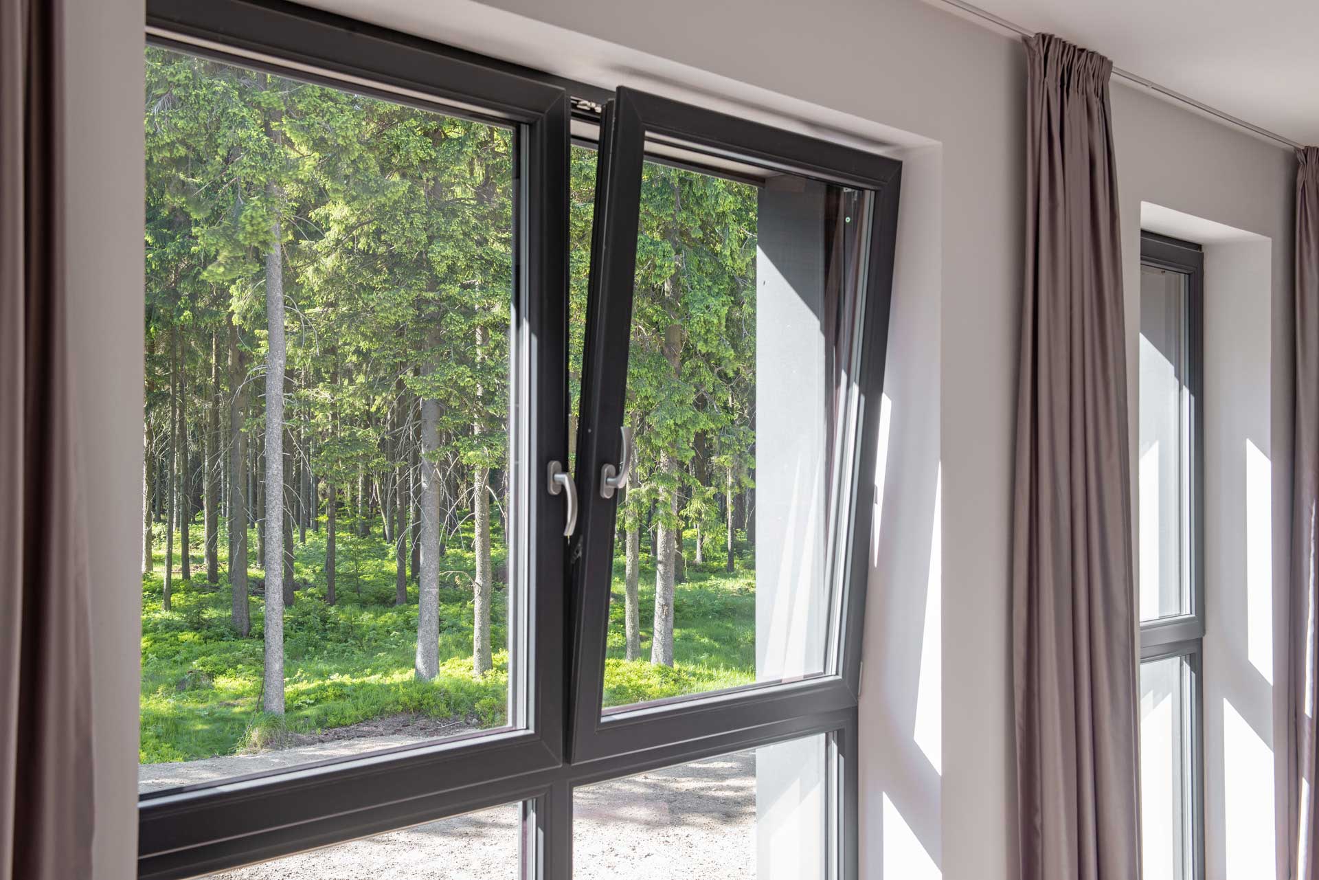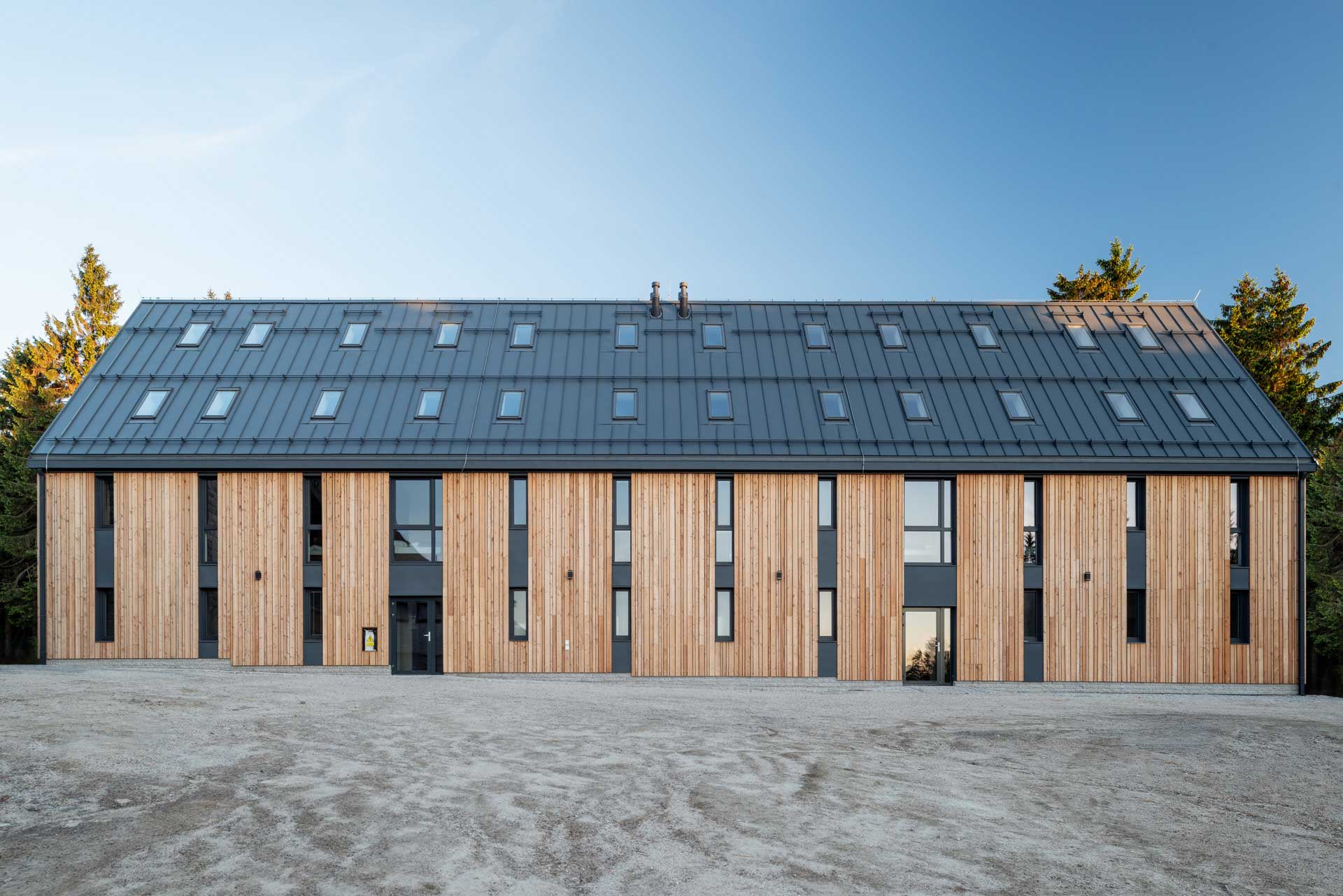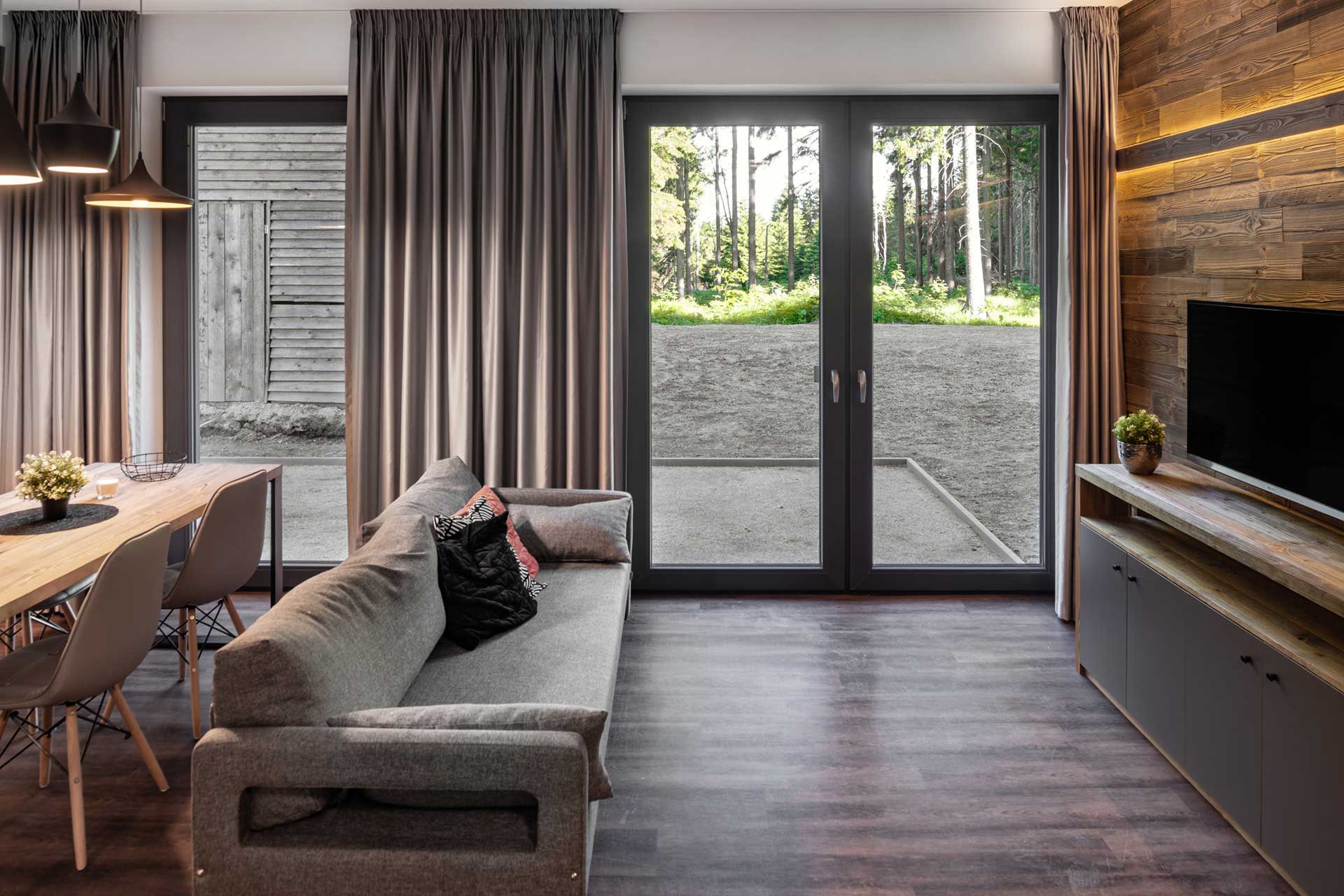 Apartmánový dom navrhoval architekt Richard Černý. Antracitové strechy, drevené obklady zo severského modrínu, sokle z miestnej libereckej žuly, ktorá je rovnaká ako tá, ktorá sa nachádza priamo na Královke. Dom na prvý pohľad upúta tiež veľkým množstvom okien s profilmi Eforte v antracitovom dekore. „Plast bol pre nás jasná voľba, chceli sme niečo odolné, čo vydrží tunajšie náročné klimatické podmienky s minimálnou údržbou. Hliník je pre mňa studený a, samozrejme, je cenovo tiež niekde celkom inde,“ komentuje výber spolumajiteľ hotelu Tomáš Fotul.