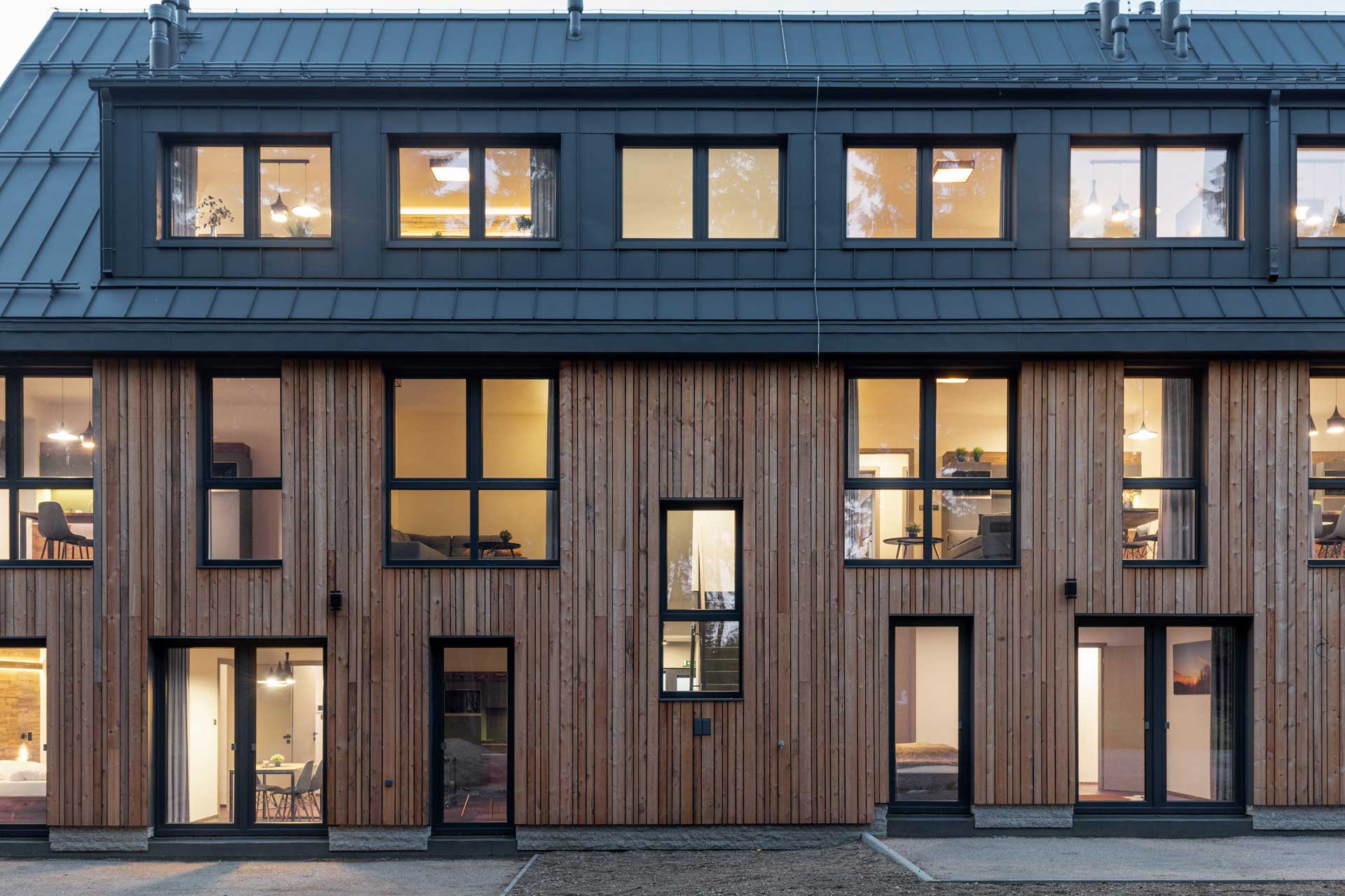 Martin Jodas z firmy Okna Tanvald, ktorá zákazku realizovala, k oknám dodáva: „Zatiaľ sme okná osadzovali na 3 apartmánové domy. Bolo to cez 150 kusov okien s celkovou plochou 284 m2, zasklených izolačnými trojsklami s Ug = 0,6 W/m2.K. Životnosť takýchto okien odhadujeme na 40–60 rokov, podľa starostlivosti pri údržbe.“ Celú stavbu realizuje firma TERMIL.