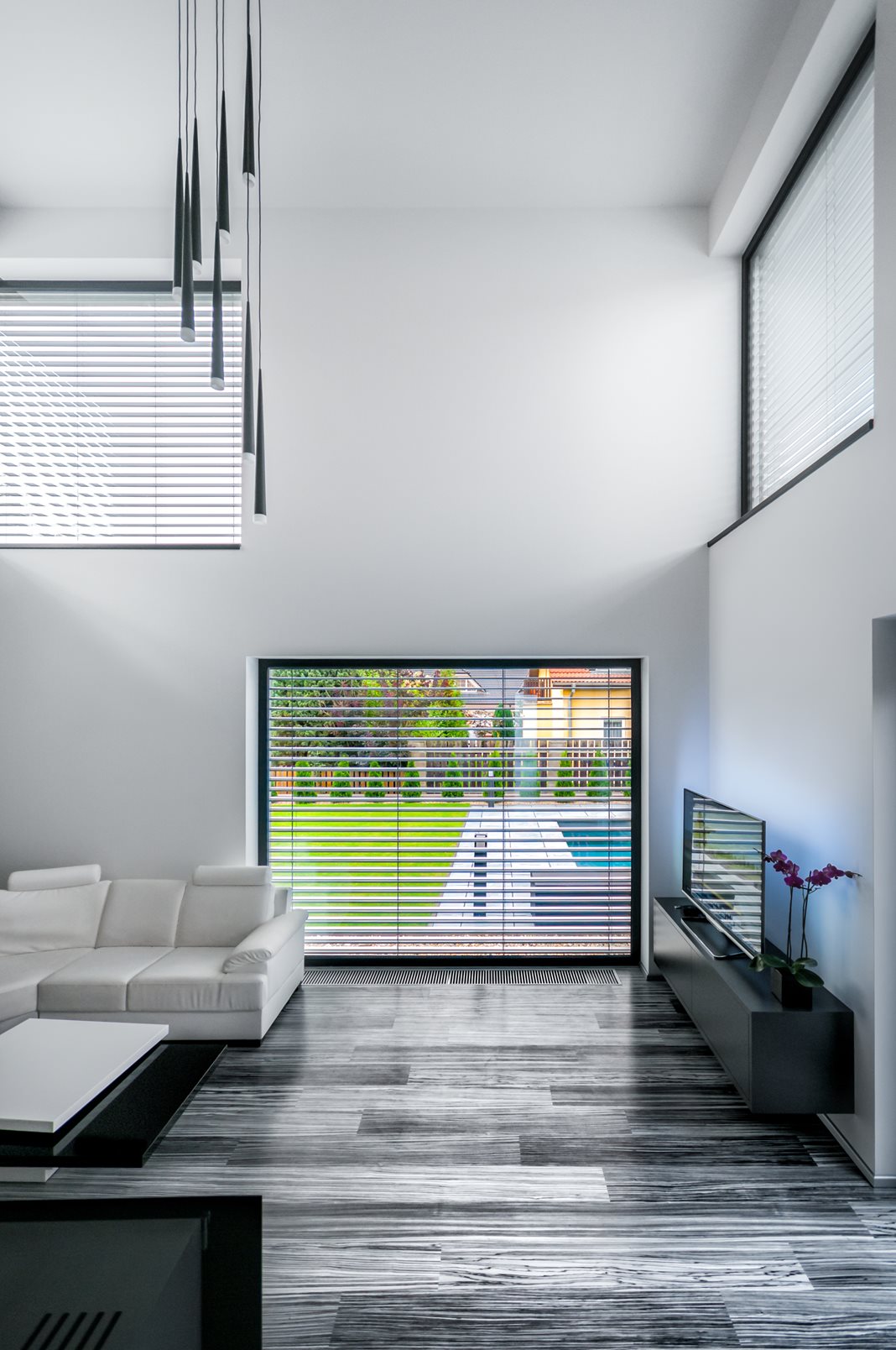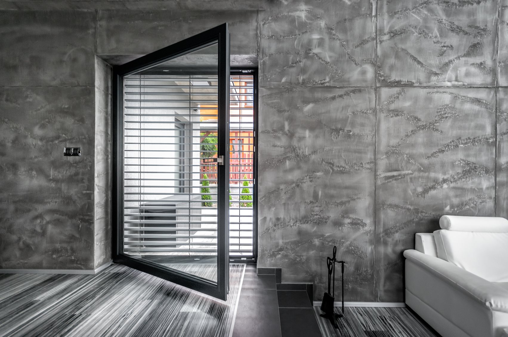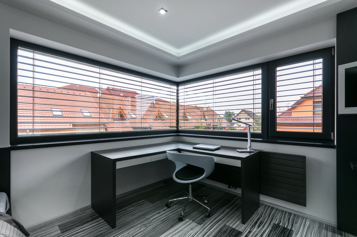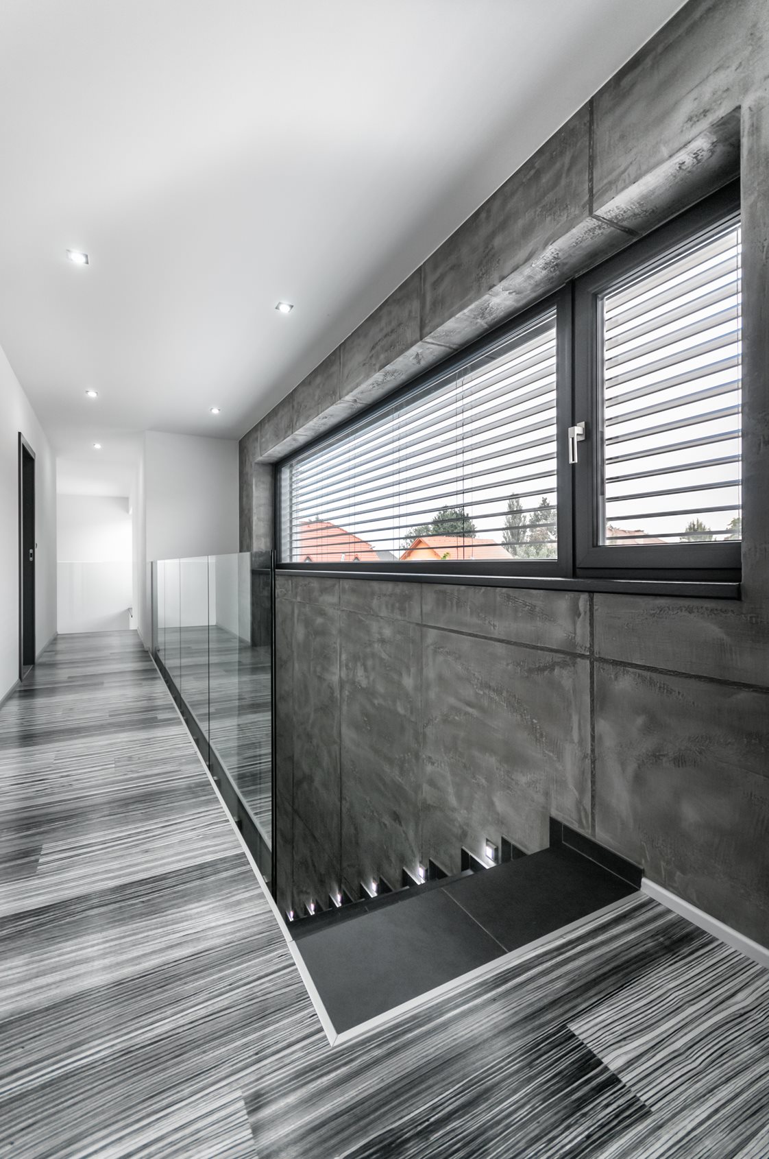 Dom charakterizujú nadštandardne veľké okná s rozmermi 3,5 x 2,4 m a 4,5 x 1,3 m. Práve sklenené tabule s mimoriadnymi rozmermi, rohové okná realizované spojom sklo na sklo (teda "bezrámové" riešenie) a posuvné dvere na terasu, všetko realizované v pasívnom štandarde, dodávajú celej stavbe presvetlenie a vzdušnosť. Zvolené okenné profily Eforte nesú bez problémov hmotnosť zasklenia niekoľko stoviek kilogramov. Sivý dekor korešponduje s farebnosťou fasády aj plechovej strechy.