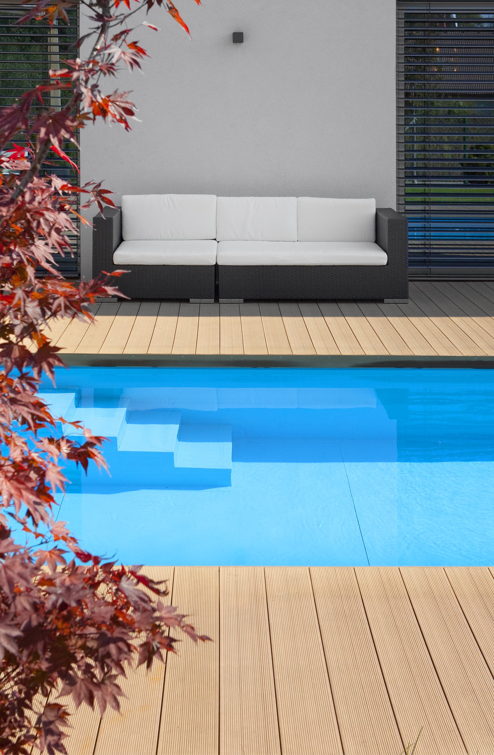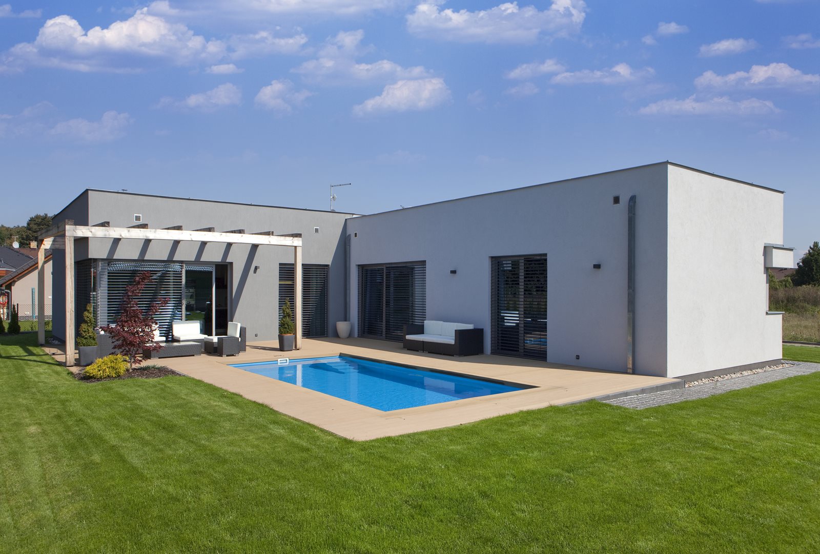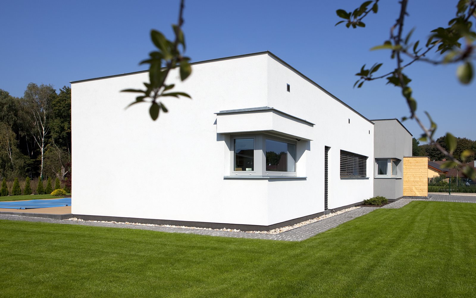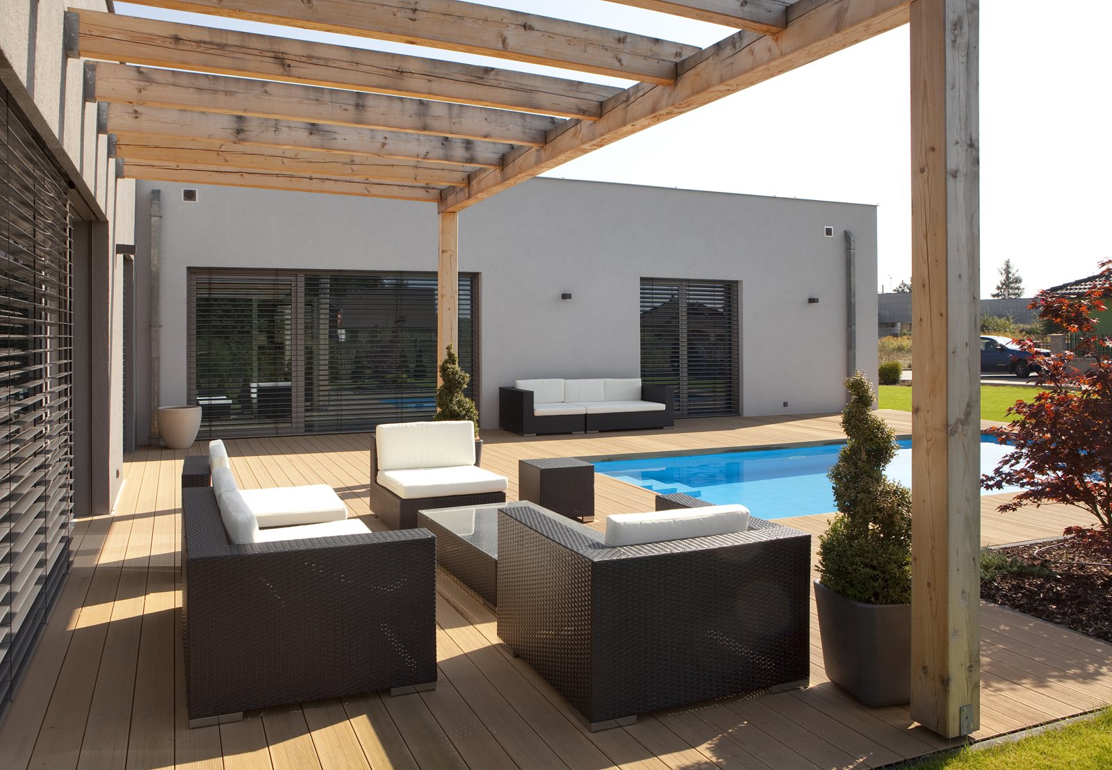 Sivý a biely kváder v tvare písmena L, átrium s terasou a bazénom, záhradný domček s letnou jedálňou a vonkajším krbom. Všetko, čo rodina s malými deťmi potrebuje. Na záhrade si zvláštnu pozornosť zaslúži moderný kompozitný materiál Twinson, použitý na terasu a lemovanie bazéna. Je veľmi stabilný, vhodný aj pre stály kontakt s vodou z bazéna. Príjemne sa po ňom chodí, pretože sa na slniečku nikdy nerozpáli. A keď sa dosky umastia, napríklad od jedla alebo opaľovacieho krému, stačí ho ostriekať vodou.