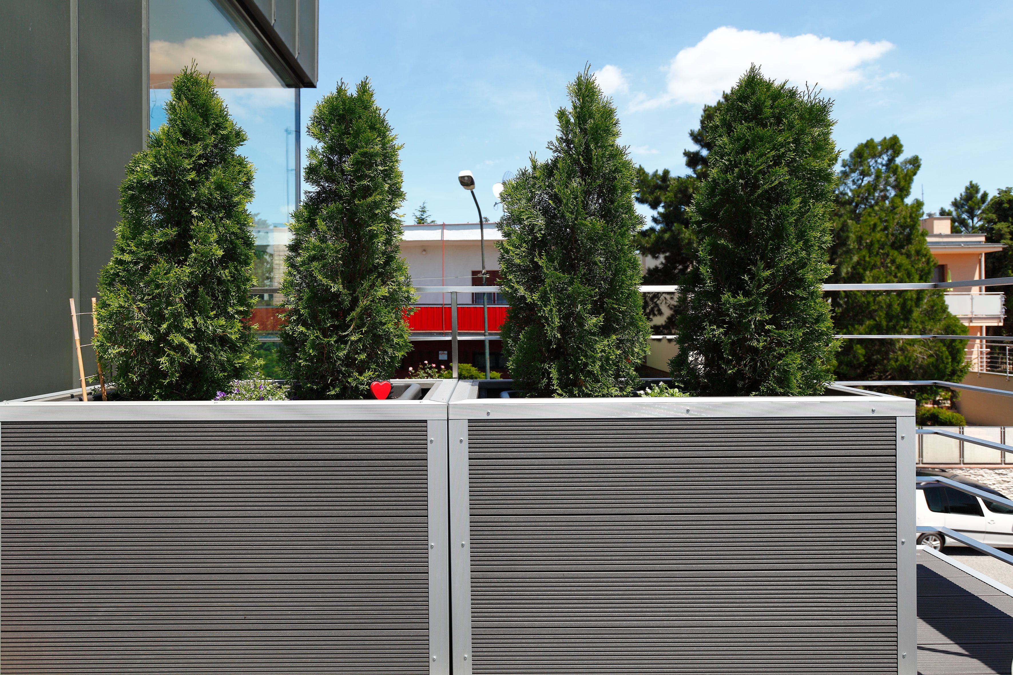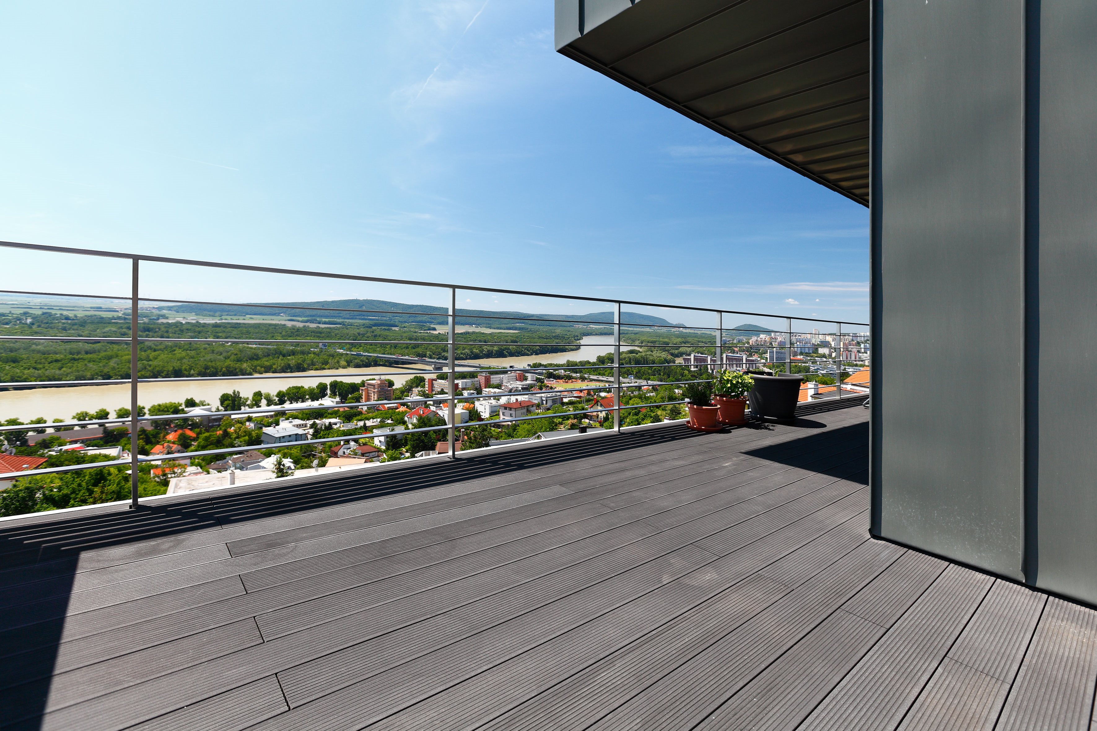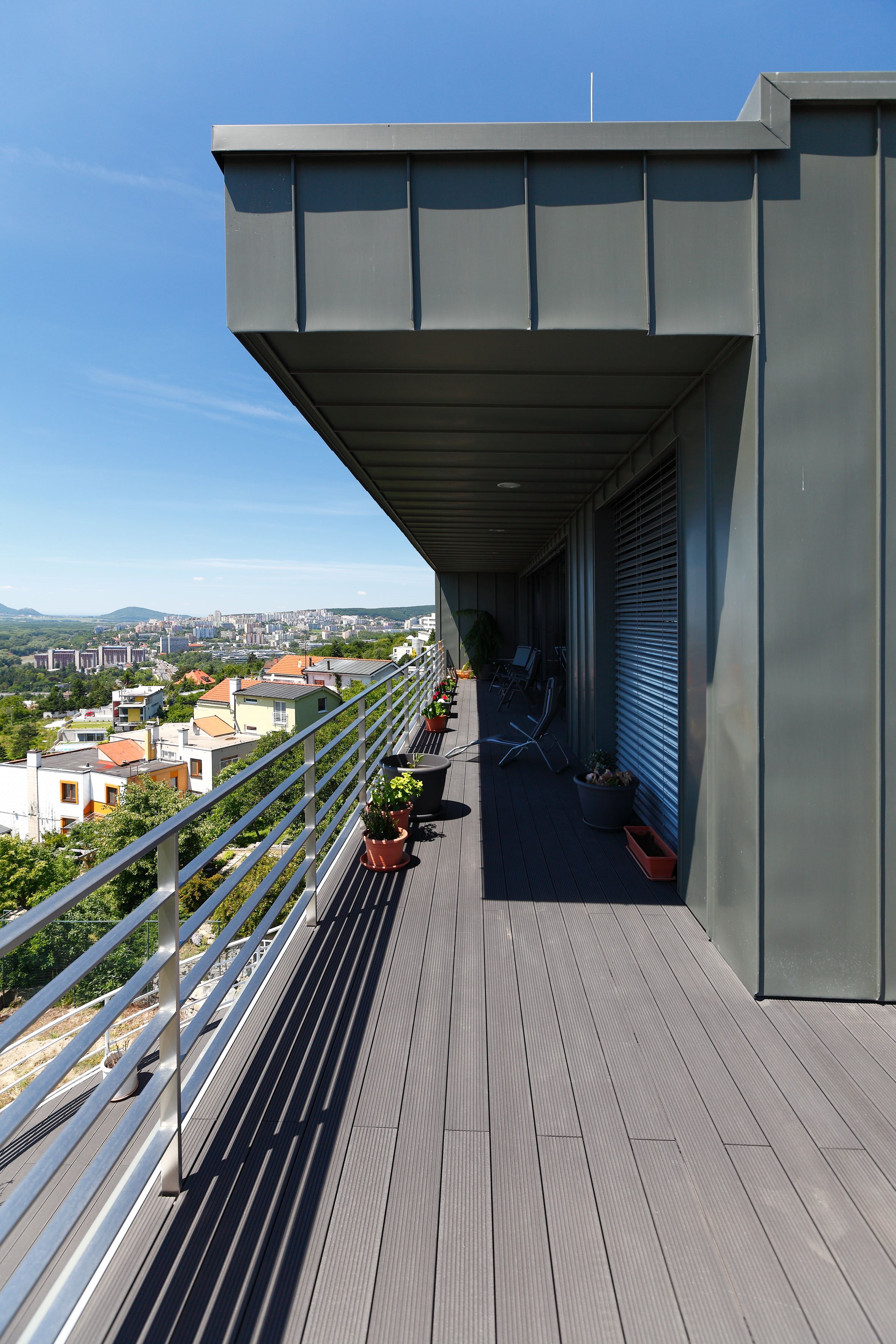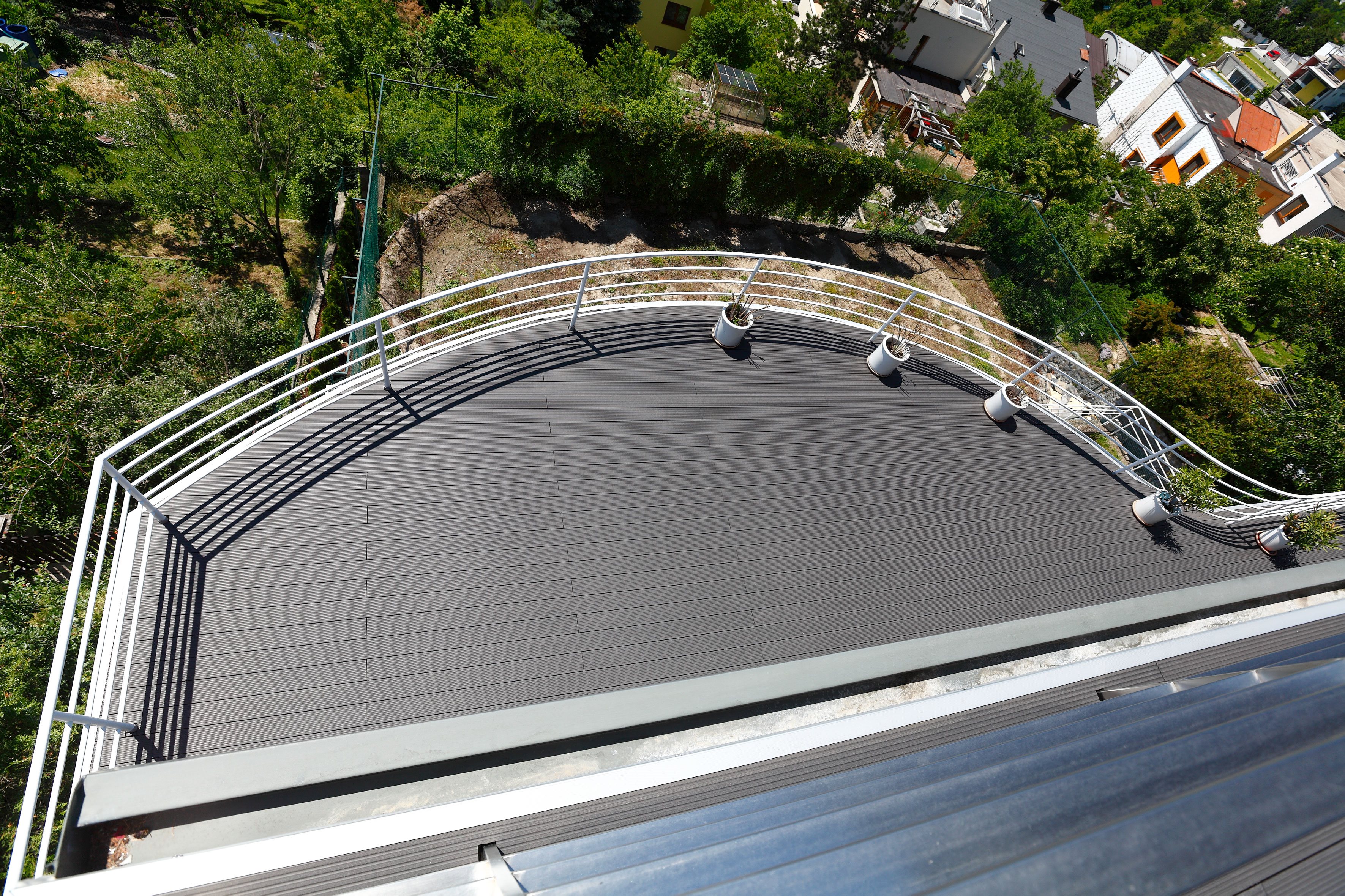 Starší rodinný dom získal nadstavbou a titánzinkovou fasádou moderný, nadčasový vzhľad. Na veľkoryso poňatých terasách s celkovou plochou viac ako 100 m2 z kompozitného materiálu Twinson si domáci vychutnávajú úchvatný výhľad na údolie Dunaja. Technický dôvtip pri montáži terasy Twinson Terrace bol nevyhnutný nielen pri realizácii terasy starých rodičov, ktorej charakteristickým prvkom je organický tvarom – polkruh. Dôležitý bol aj výber podkladového profilu. Vzhľadom na fakt, že sa terasy v nadstavbe realizovali na netradičnú železnú konštrukciu a podklad tvorili OSB dosky, zvolil realizátor nosný hliníkový profil. Vďaka tomu sa zabezpečila dostatočná pevnosť a optimálna výška. Z kompozitného materiálu Twinson si majitelia domu dali na mieru vyrobiť aj kvetináče, ktoré oddeľujú terasu od ulice a nahrádzajú plot.